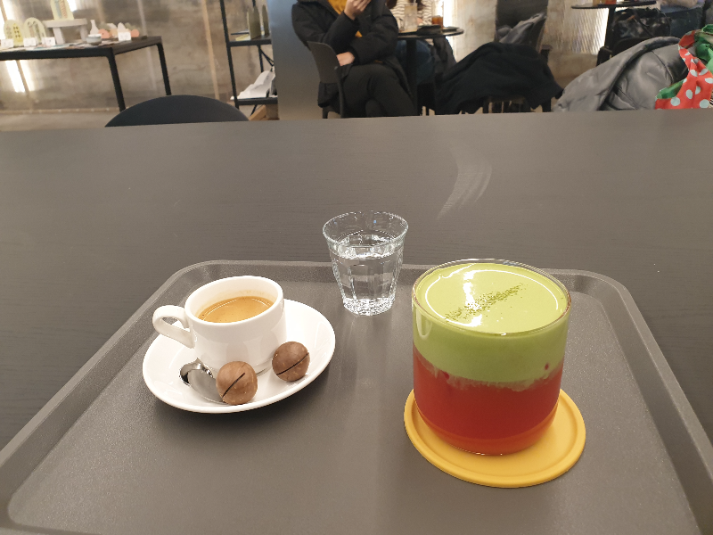 주변을 둘러보고 사진도 찍고 하면서 음료가 나오길 기다렸다. 드디어 주문한 에스프레소와 수박 말차가 나왔다. (에스프레소는 세 가지 원두 중 하나를 고를 수 있었다. 나는 산미가 있는 드립앤드롭 블렌드-에티오피아 내추럴과 워시드의 조합-를 선택했다.)