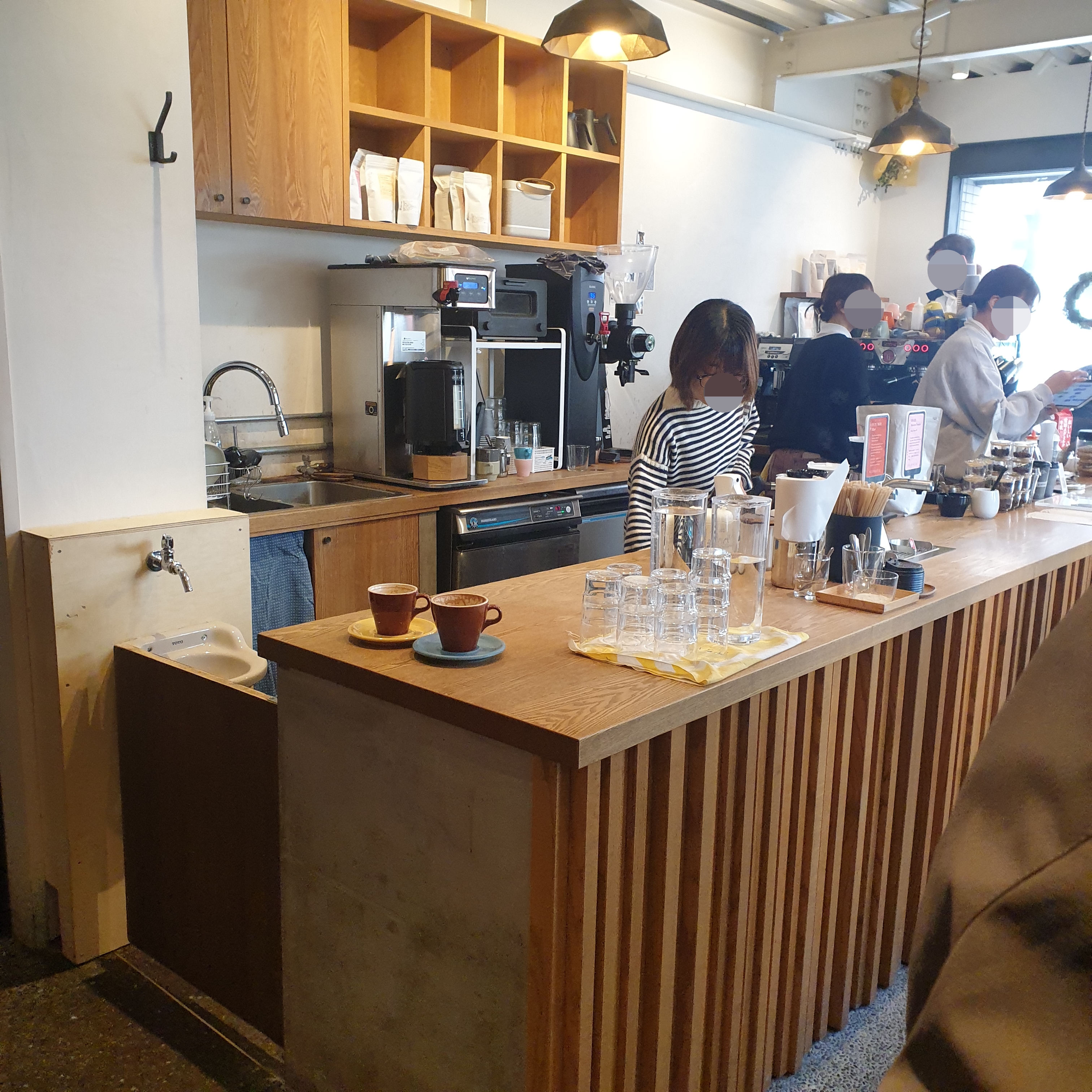 전체적으로는 화이트와 우드로 인테리어 되어 있었고, 매장은 넓지 않았습니다. 들어가면서 우측에 카운터와 커피를 추출하는 공간이 있었고 좌측에 스탠드 테이블과 의자 4개가 일렬로 있었습니다. 아침부터 직원이 세 명이나 있을 만큼 고객들이 꾸준히 들어왔습니다.
