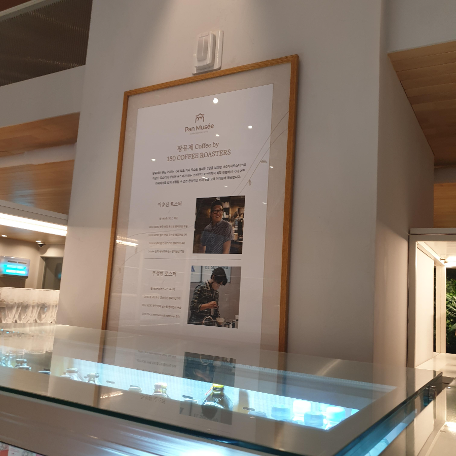 한쪽 기둥에는 '한국 커피 로스팅 챔피언십에서 우승한 이승진 로스터와 주성현 로스터가 생두 소싱부터 로스팅까지 직접 진행해 환상적인 커피 맛을 제공한다'는 액자가 걸려있습니다. 빵과 함께 커피에서도 자부심이 느껴졌습니다.