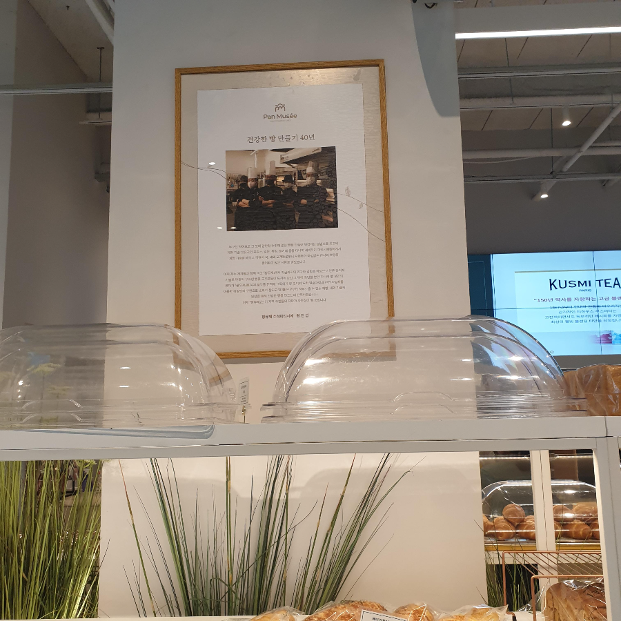 기둥 하나에는 액자가 하나 걸려 있습니다. 그 액자에는 '누구든 먹어보고 그 맛에 감탄할 수밖에 없는 빵을 만들어 보겠다는 일념으로 여러 나라의 세계적인 파티시에들에게서 제빵 기술을 배웠고 익혔고, 이제는 팡뮤제를 통해 이 지역 주민들의 자랑과 자부심이 되고자 한다'는 각오가 담겨있습니다.