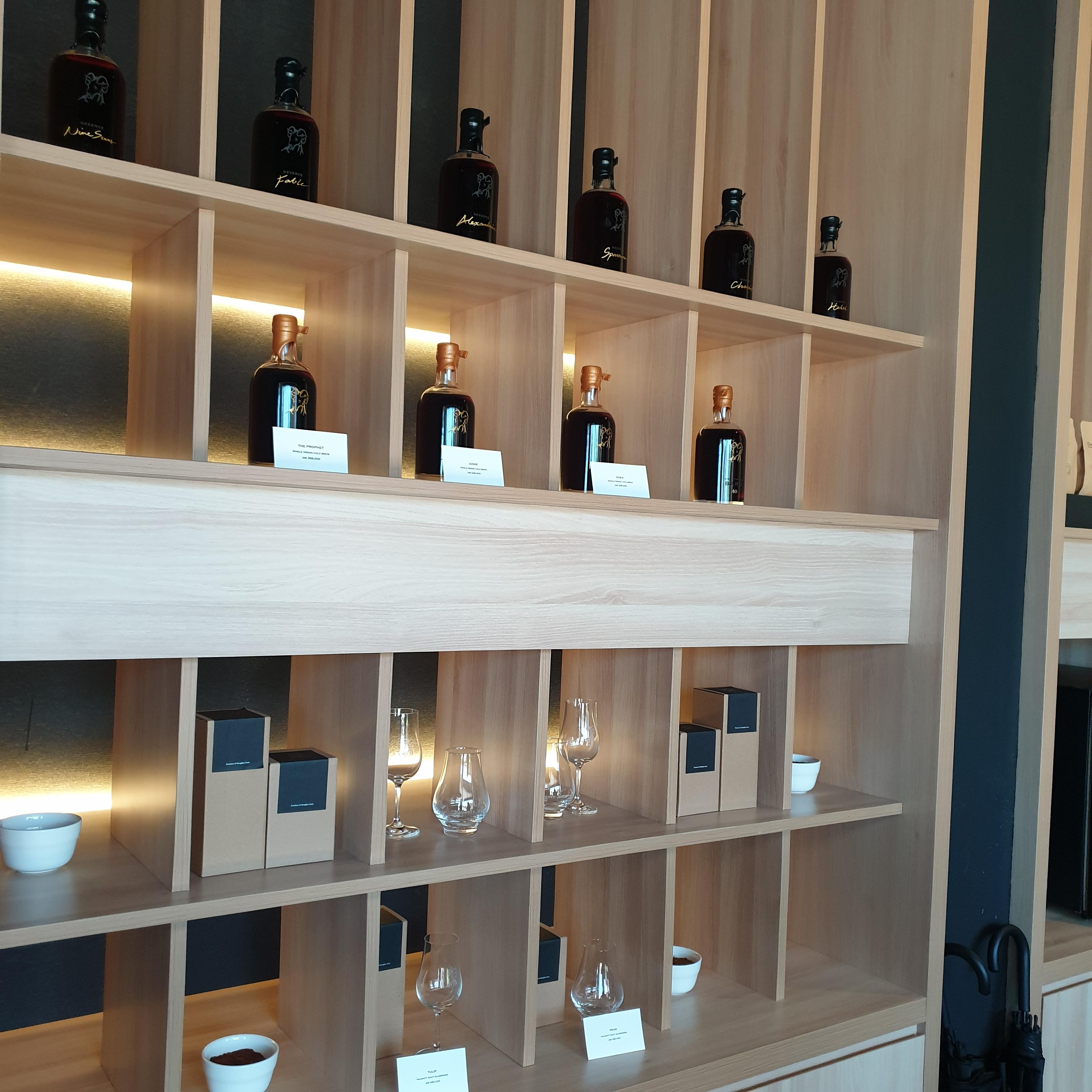 문을 열자 카페가 아닌 응접실 같은 공간이 나왔습니다. 어두운 블랙에 우드 집기로 인테리어가 되어있어 꽤 고급졌습니다. 한쪽에는 판매용 콜드 브루들이 위스키병과 같은 모양의 병에 담겨있었습니다. 초로 씰링까지 해놓아 매우 고급스러워 보였습니다. 원두 봉투도 보였는데 나중에 확인하니 원두는 판매하지 않는다고 했습니다. (8월부터는 판매를 고려하고 있다고도 말했습니다.)