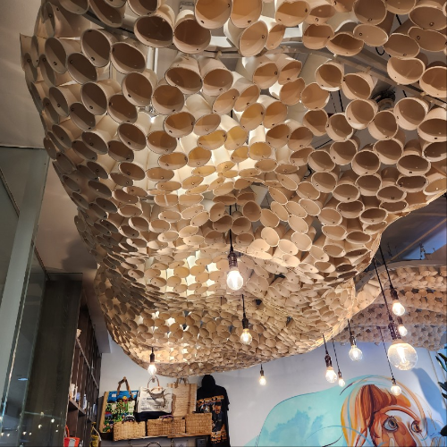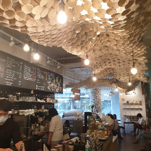 천정에 진열한 종이컵들이 눈에 들어왔습니다. 연결된 종이컵은 꽤나 강렬한 인상을 주었습니다. 매장 내는 대기할 정도는 아니었지만 사람들은 꽤 있었습니다.