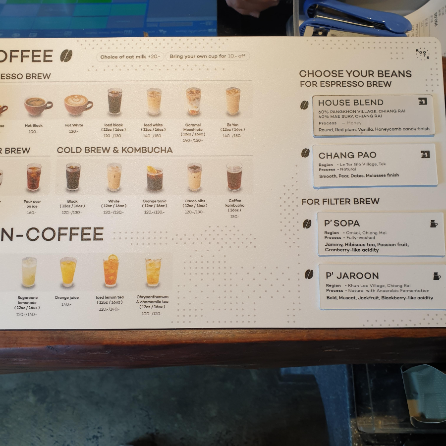 ROOTS는 원두 맛에 집중하여 완성도 높은 커피를 자랑합니다. FACTORY COFFEE에 비해 메뉴는 단출하지만 제 입맛에 맞는 커피로 만족했던 카페였습니다. (방콕, 치앙마이 통틀어) 맛으로 보면 가장 만족했던 태국 카페 중 하나입니다.