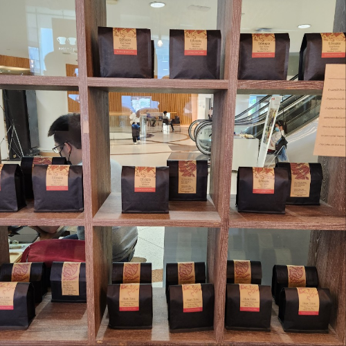 핸드 드립(필터) 커피의 경우 여러 가지 원두를 고를 수 있었습니다. 판매용 원두도 한쪽에 진열해 놓고 있었습니다. 태국산 원두와 수입 원두(에티오피아 등) 등 다양한 원두를 선택할 수 있었습니다.