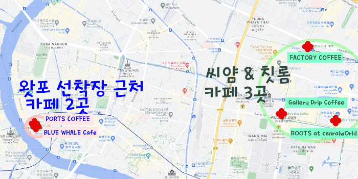 앞으로 소개해드릴 카페 중 씨얌 & 칫롬에 있는 FACTORY COFFEE, Gallery Drip Coffee, ROOTS at centralwOrld는 사전에 방문하기로 했던 곳이었습니다. 반면, 왓포 선착장 근처 카페는 숙소 주변에 있어 들어간 카페입니다. 앞의 세 개의 카페는 개별로 왓포 선착장 카페는 묶어서 소개해드리겠습니다.