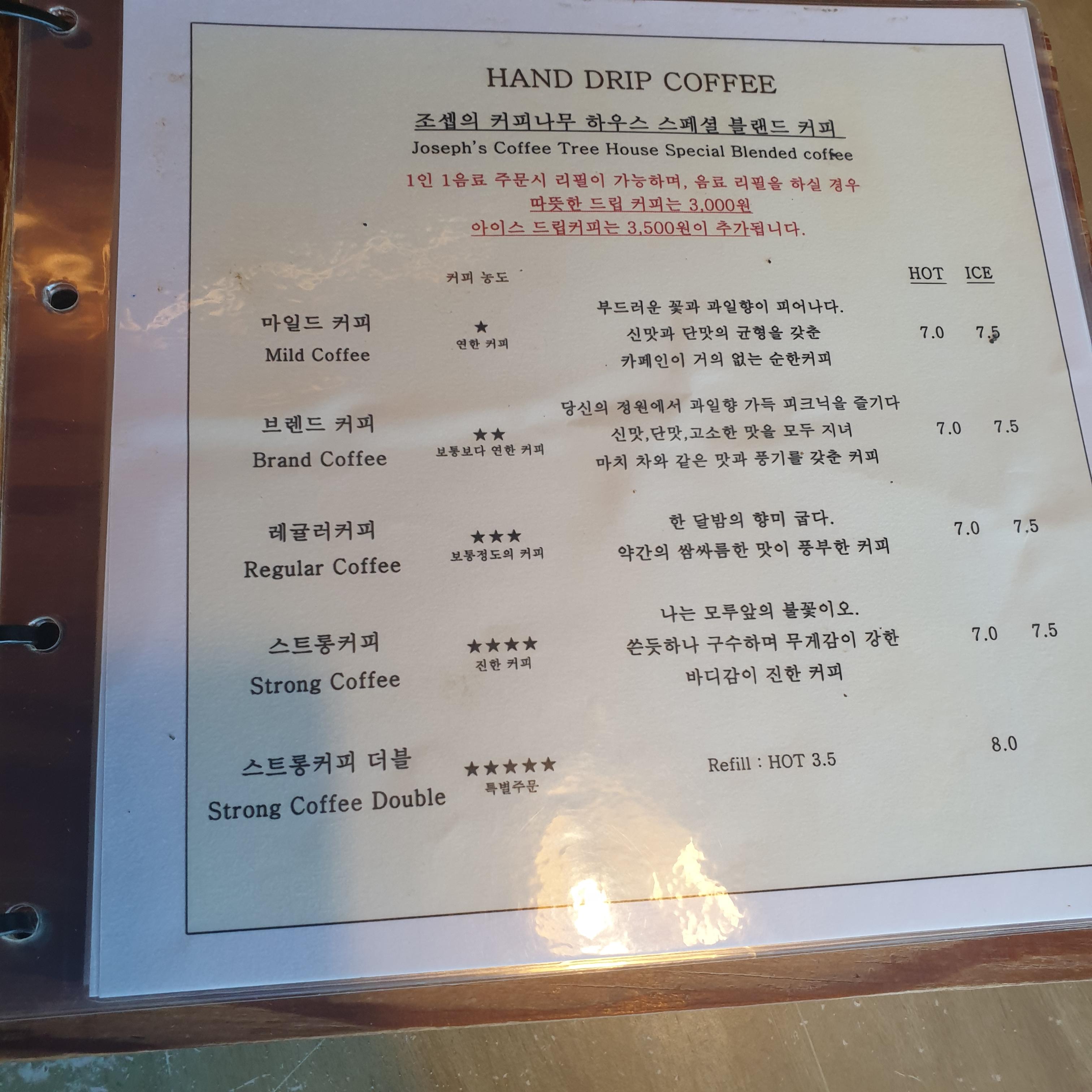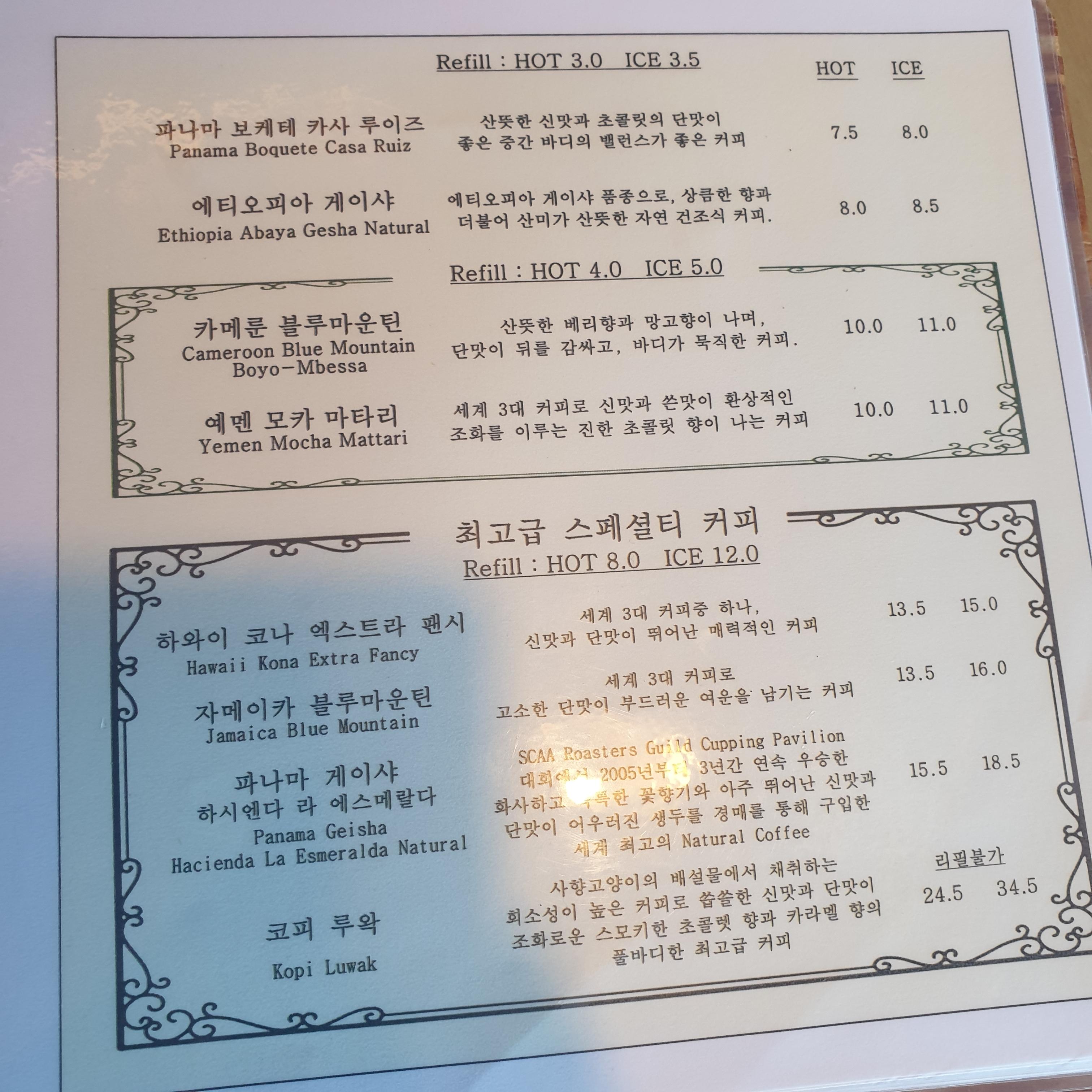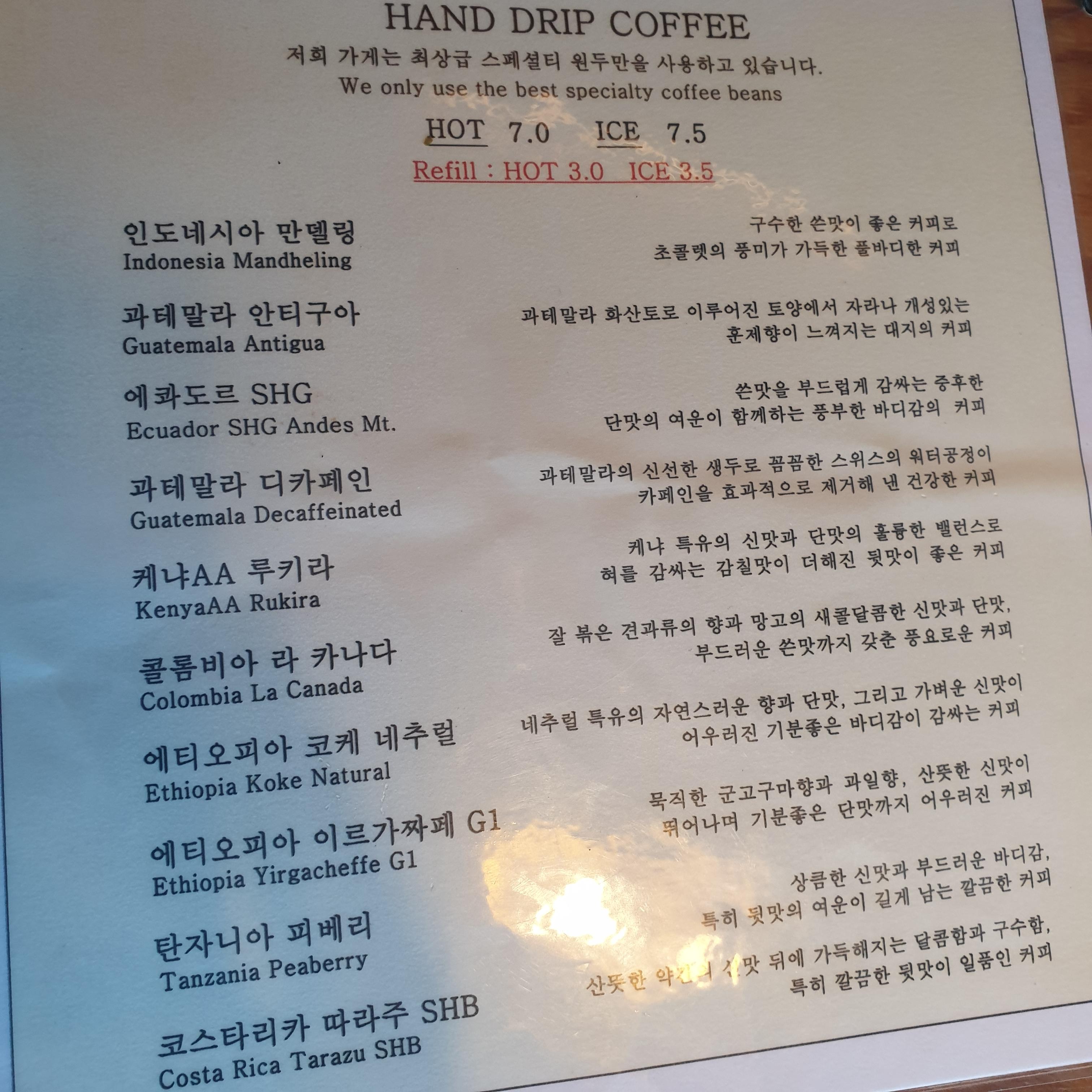 에스프레소 바리에이션 커피와 핸드드립커피가 모두 있었습니다. 핸드드립은 18종의 원두를 고를 수 있었고 커피 농도도 5단계로 주문 가능했습니다. 또한, 코피 루왁 원두를 제외하고는 모든 커피가 리필이 가능했습니다. 다만 리필 요금이 추가되는 형식인데 에스프레소 바리에이션은 2,000 원 (아이스는 2,500 원), 핸드드립은 원두마다 금액이 상이했습니다.