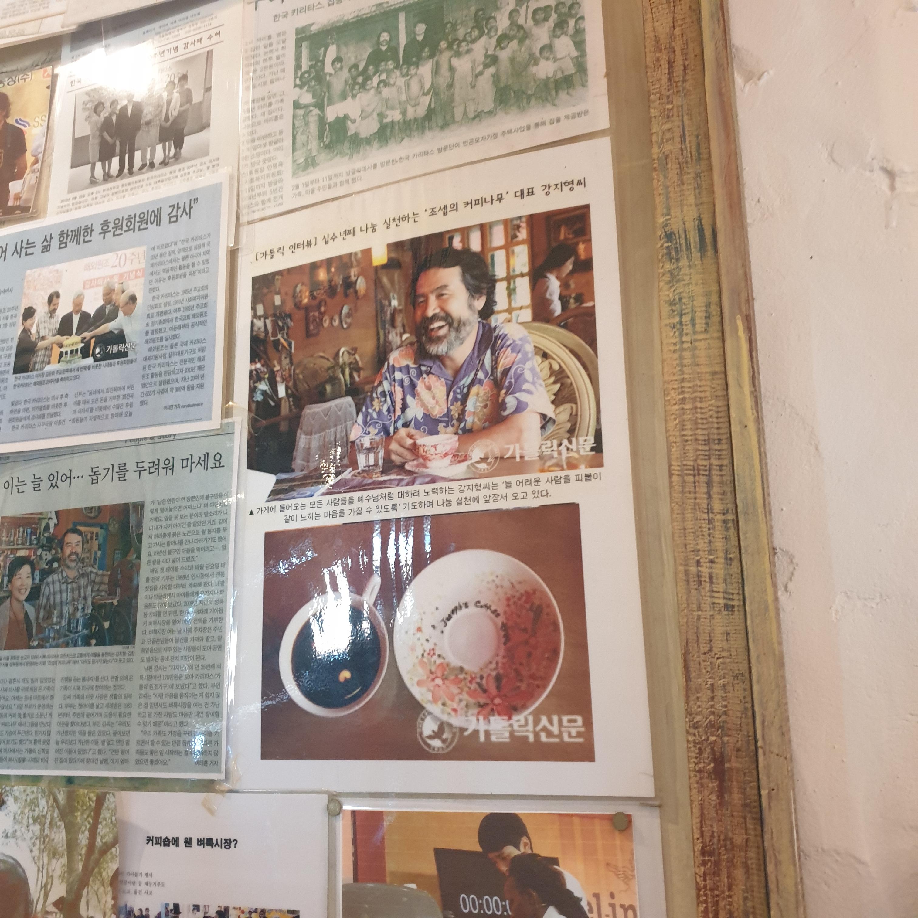 2층으로 올라가는 계단에는 사장님에 관한 기사를 스크랩해 둔 공간이 있었습니다. 커피 관련 일을 오랫동안 해오셨고 업계에서 유명한 듯 보였습니다.