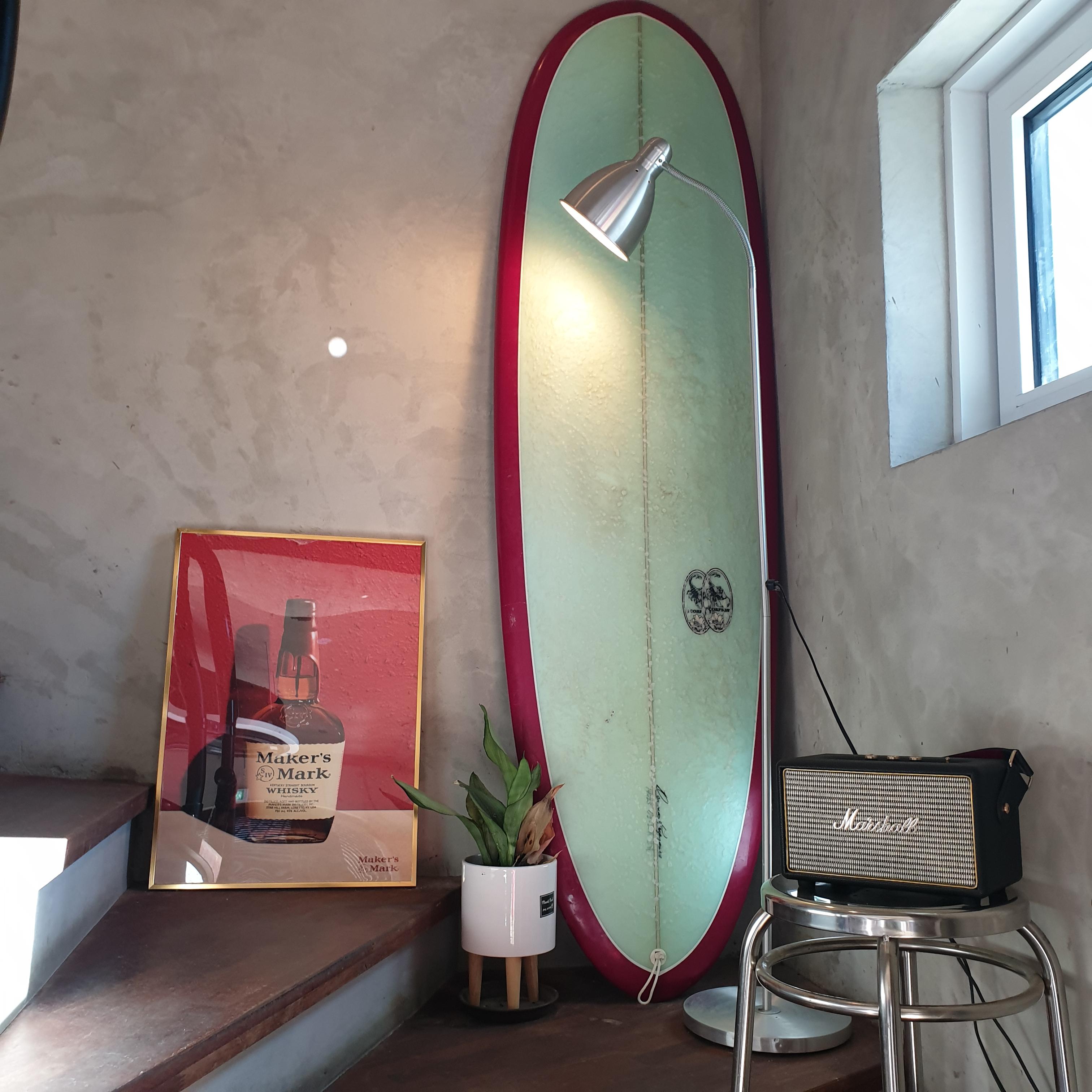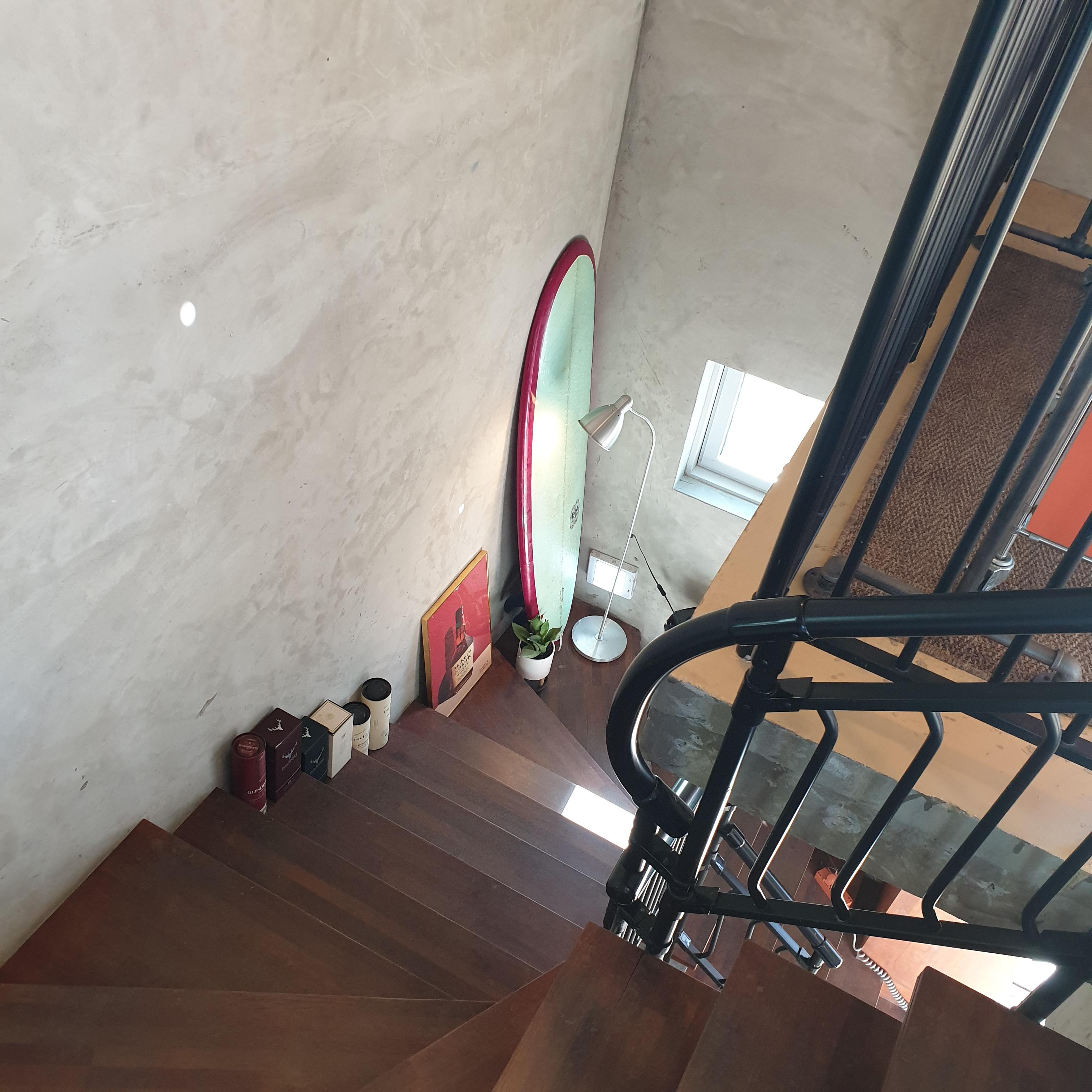 2층 올라가는 계단에 비치된 서핑 보드