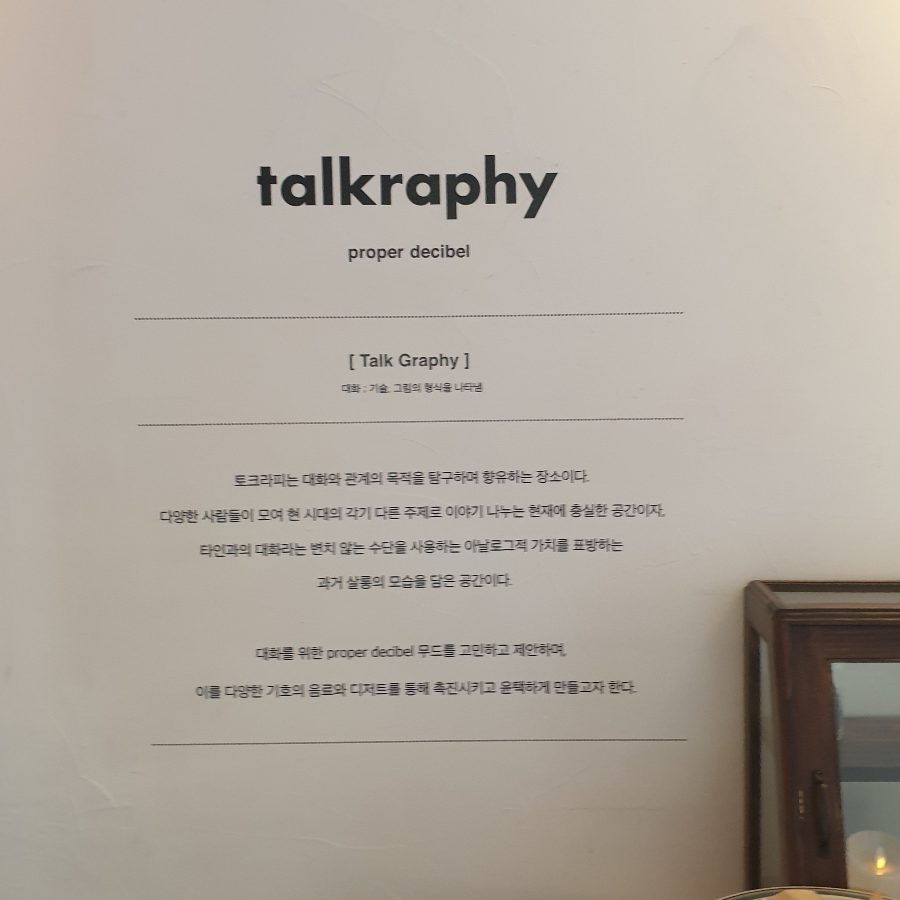 좌측 출입문으로 들어가면 우측 벽면에 '대화와 관계의 목적을 탐구하며 향유하는 장소'라는 토크라피의 의미가 적혀있었습니다. 본관 및 별관에 작은 방들이 대화에 집중하기 위해 만들어졌다는 의미로 보였습니다. (뒤에서 이야기하겠지만 카페 구조가 독특합니다.)