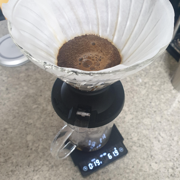 3) 뜸 들이기: 93°C 또는 90°C 의 물 60g으로 30초 동안 뜸 들이기를 합니다. 이때, 스위치를 열어 추출된 커피가 서버에 떨어질 수 있게 합니다.