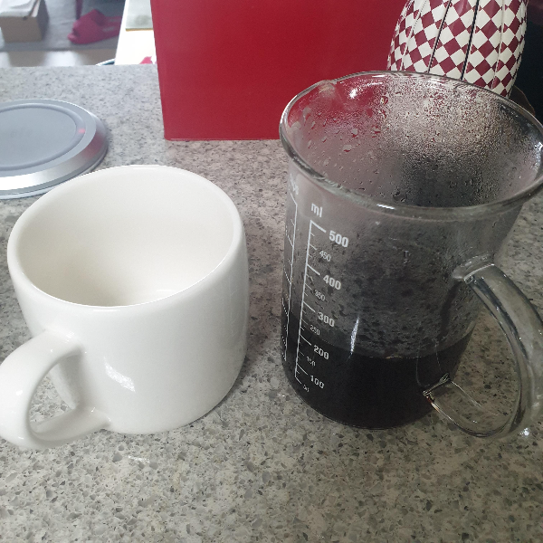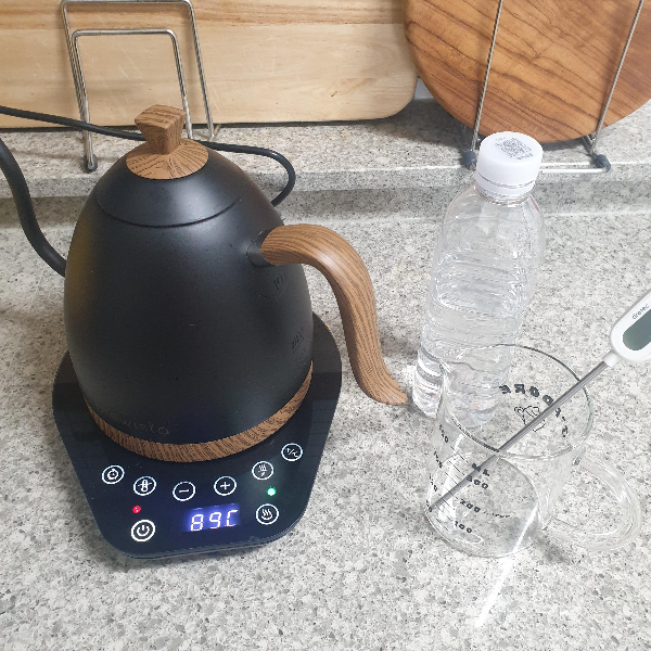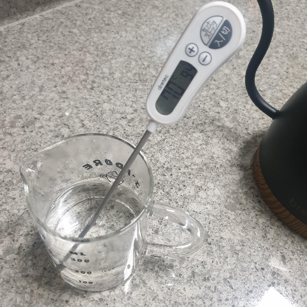 5) 물 온도 낮추기: 1차 Pour 가 끝나고 2차 Pour 전에 물의 온도를 70°C로 만듭니다. 1차 Pour후 2차 Pour까지 시간이 많지 않으니 찬 물과 물컵 그리고 온도계를 미리 준비합니다. 물론 드립포트에 찬물을 부어 온도를 맞춰도 됩니다.